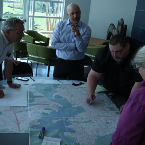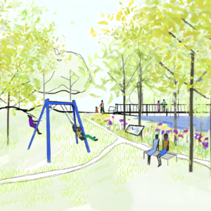 Nature based solutions use environmental designs to help solve problems, like flooding, in cities and communities. They include things like planting trees to cool down hot areas, or restoring wetlands, planting rain gardens to retain stormwater, and building stormwater parks which soak up rain, reduce runoff, and prevent water from overwhelming streets and homes. These solutions can improve water quality, protect homes, and create more green spaces for people to enjoy.