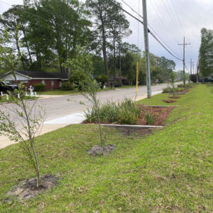 A raingarden in front of Kreole Elementary School in Moss Point, MS filled with water and fully functioning.
